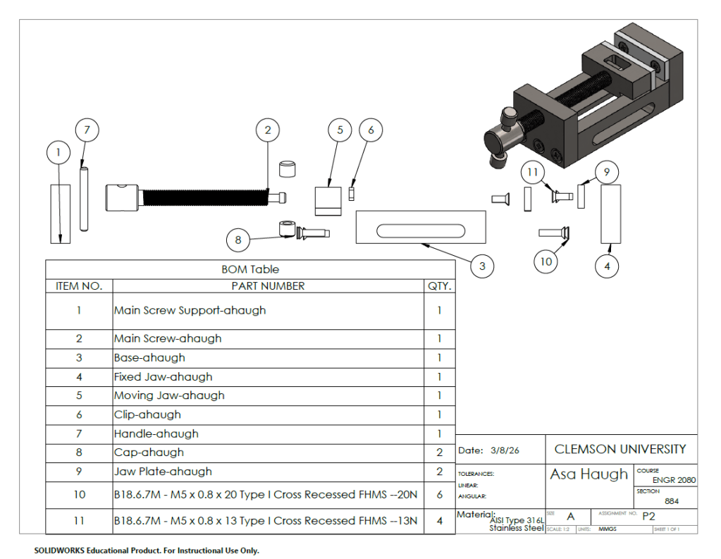 As apart of my SolidWorks course at Clemson University, I was assigned with creating a working vise using the Solidworks software. Students were given a variety of part drawings with incorrect dimensions and tasked with building the incorrect parts, assembling the vise, and further correcting the dimensions of the parts in order to create a working vise.